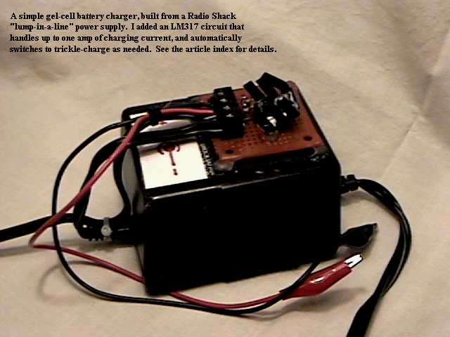 I added an LM317 circuit to the top of a Radio Shack "lump-in-a-line" 12 VDC power supply. This made a gel-cell battery charger that is thermally limited to about one amp, and automatically switches to trickle-charge when necessary. NOTE: You CANNOT use this charger for NiCd or NiMH batteries. Total cost to build is under $20; if you have a well-stocked junk box, you can do it for zip. Here is a picture (177K). See May 1994 in the article index.