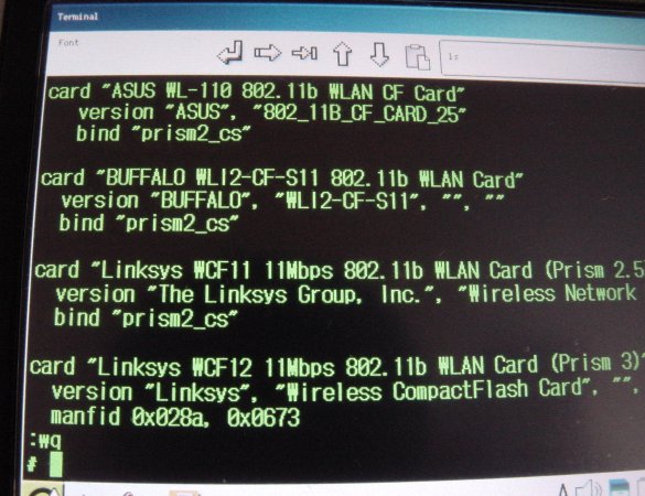 How to use Buffalo wli2-cf-s11 WiFi card with SL-C700 / SL-C750 / SL-C760 (tested with SL-C700, will test with others asap) I got most of this tip from here In Terminal type cardctl ident with the Buffalo wli2-cf-s11 WiFi card in the slot. (I guess this will work with any WiFi card with a PRISIM chipset). Note the output, then edit the wlan-ng.conf file in /etc/pcmcia so that it looks like the following:(if you make it look exactly like this it should work). you could also follow the great guide here in "terminal" here are some useful commands: - type "i" (insert mode) (press "cancel" key for command mode, "x" delete under cursor). - save the file (press "cancel" key for command mode, then type ":wq" )