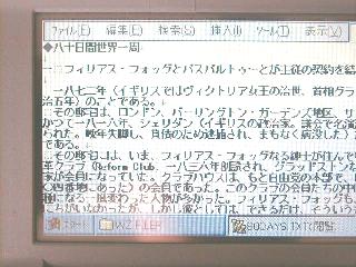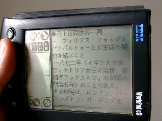 解像度は320×240程度のようですが、大きさは文庫本数冊分はあります(しかもフロッピーディスクドライブは外付け)。液晶画面の視認性はなかなか高く良いのですけれども、今ではさすがに数世代前の機器という印象を受けます。