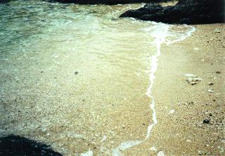 軽く泳いだ後、荷物に戻ってコンタックスT3を持ちだします。波しぶきをあびても使えるか耐久試験です。波間に見える屋久島の山は、山頂付近が雲に覆われています。きっと雨なんだろうなあ。