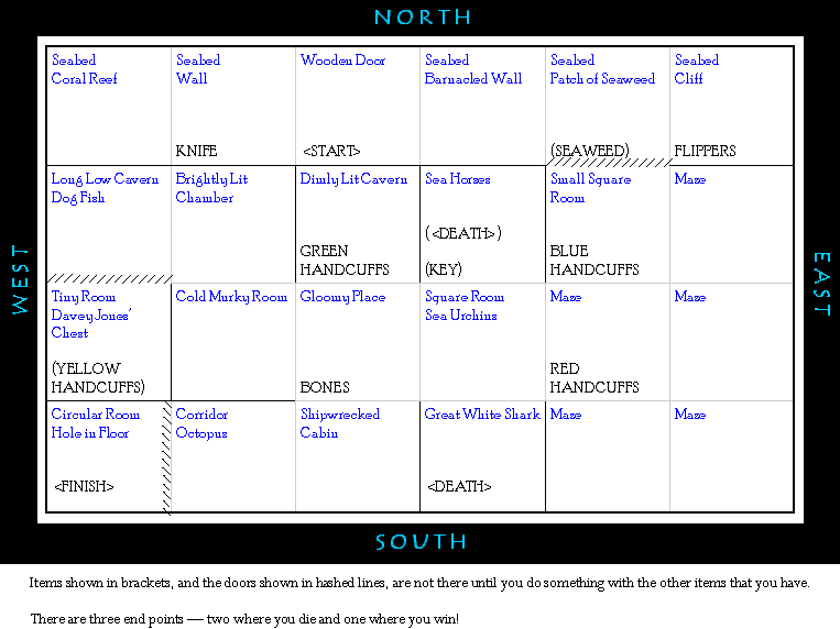 Text-based adventure game in which you have to replace a plug in the seabed to stop all the water draining away. If you get stuck, download Map of Neptune's Caverns.