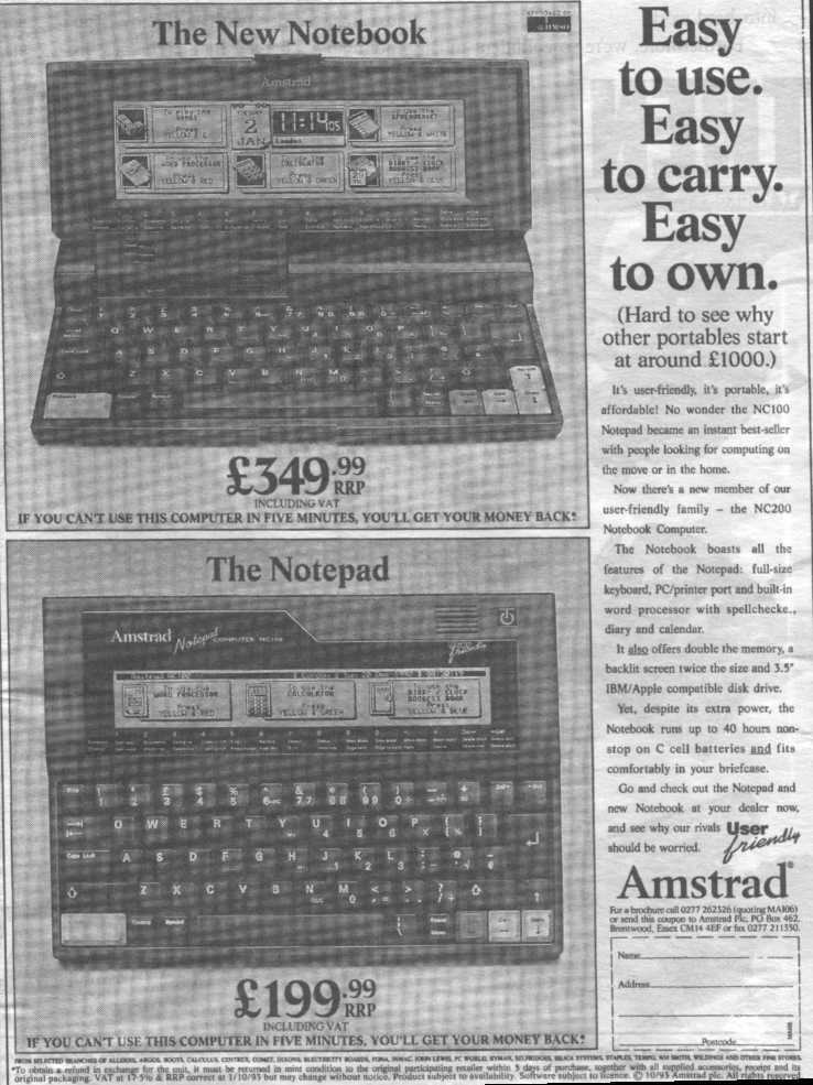 To achieve this ease of use, the design of the Amstrad Notepad and Notebook computers includes coloured keys for accessing their major functions. Another useful feature for the new computer user is the 'Stop' button that will cancel any action that the user does not want to happen. Although easy to use, the Amstrad NCs should not be underestimated-- they all have advanced features such as spell checking and mail merge in their word processor software, and even allow you to program them using the BBC BASIC programming language.