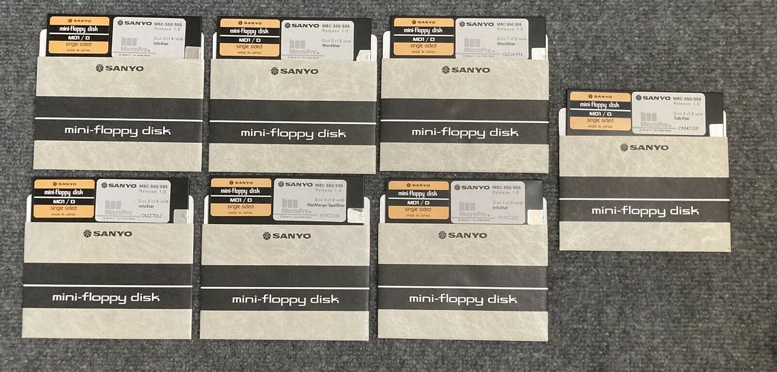Outside of Japan, all units shipped with two system disks: MS-DOS v2.11 and SANYO BASIC, plus an 'Applications' floppy disk with productivity software from MicroPro comprising WordStar, SpellStar, and InfoStar. In some cases a different word processor was shipped - EasyWriter in place of WordStar.