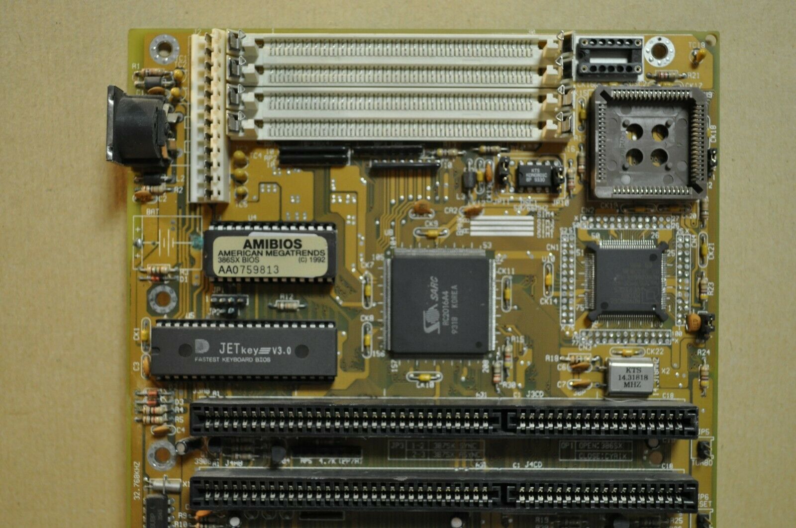 It has six 16-bit ISA slots, and supports 2 banks of 30-pin SIMM memory (386SX boards have a 16-bit external data bus - 30-pin SIMMs are 8-bit, so two are needed for the full width). Maximum onboard RAM is 16 MB.