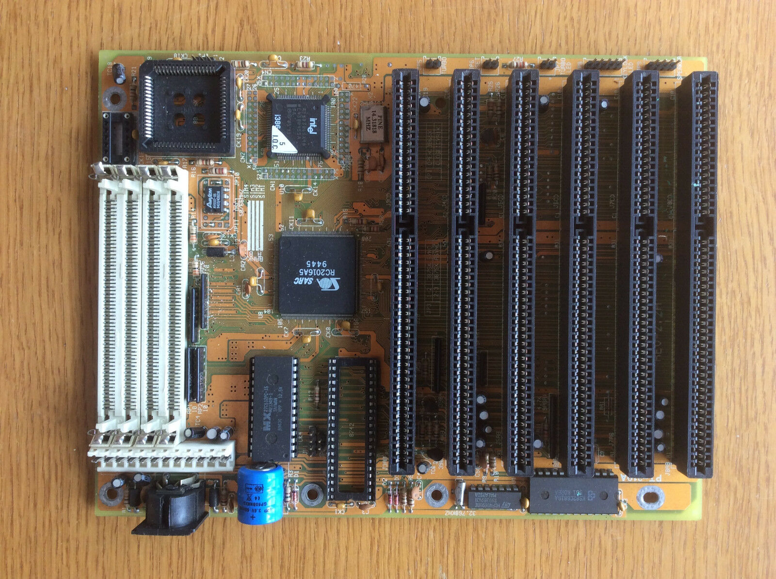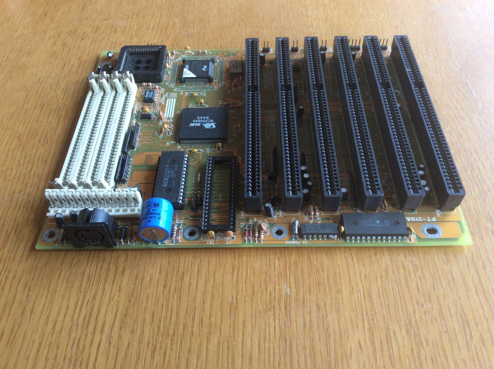 This is a late 386SX motherboard by Pine Technology in a compact Baby AT form factor with 7 ISA expansion slots.