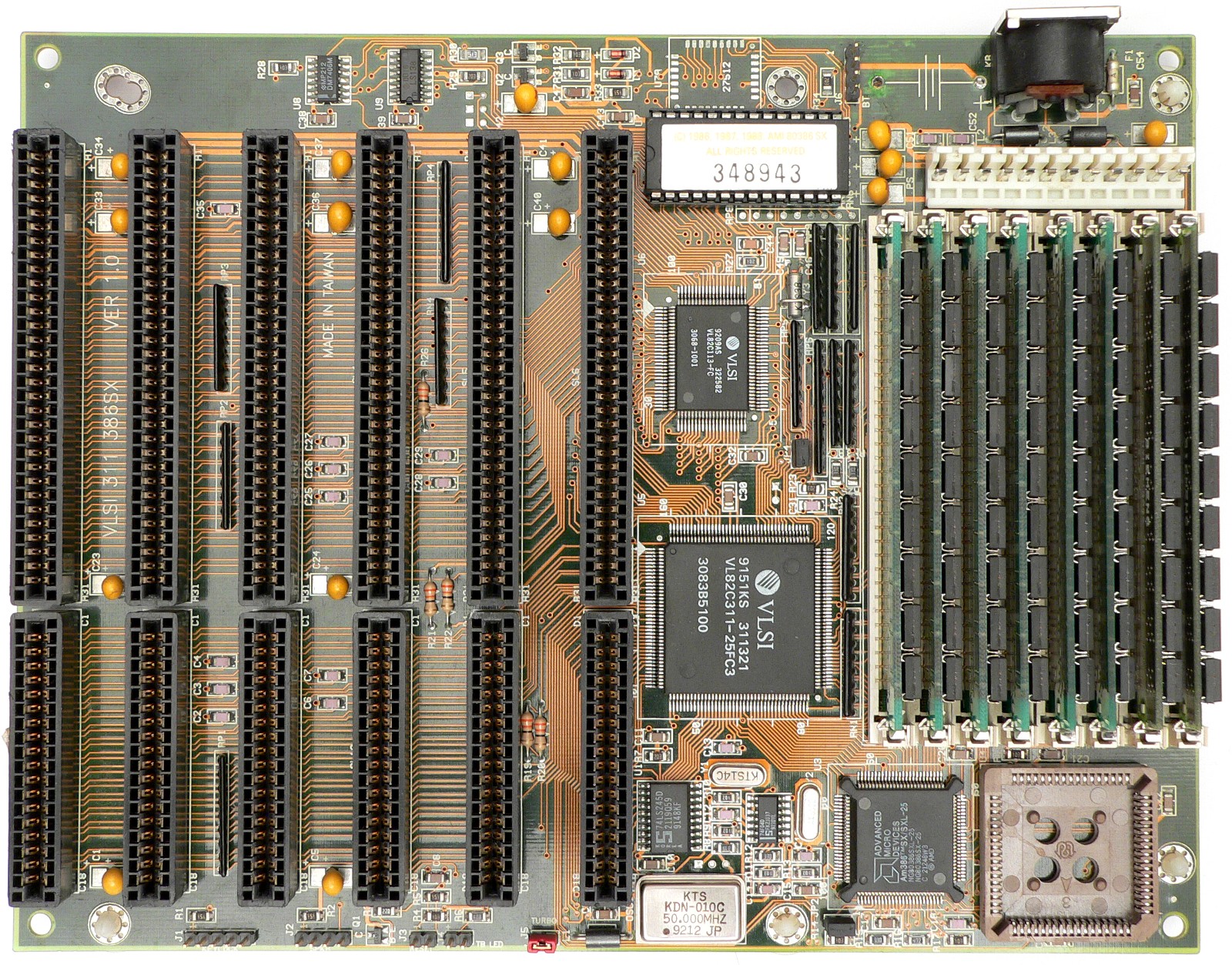 It has a PQFP soldered-in Intel 80386SX-25 CPU. The AMI BIOS chip looks like it has been replaced. Chipset-wise, this uses the VLSI 82C311 SCAMP chipset.