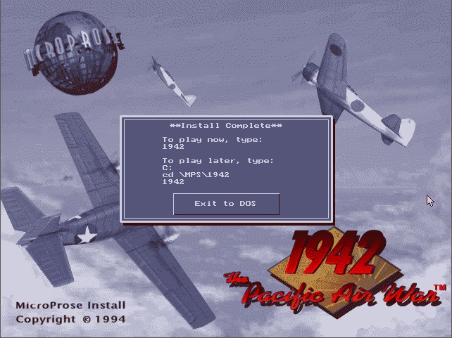 The game is installed using the INSTALL.EXE utility. By default the game will be installed to C:\MPS\1942. It can be installed from a floppy drive or from a subdirectory on your hard disk that has all the files from each floppy present. You do not need to use SUBST to make this subdirectory appear as a floppy drive (in fact it won't work as it checks to see if the 'source' is a physical drive).