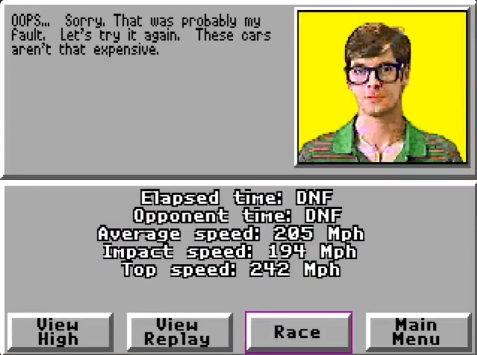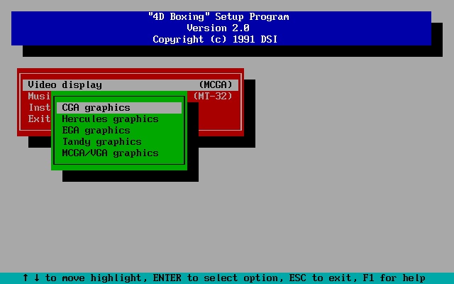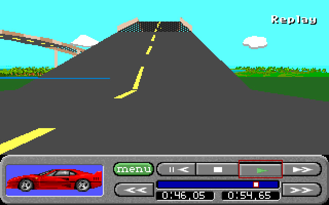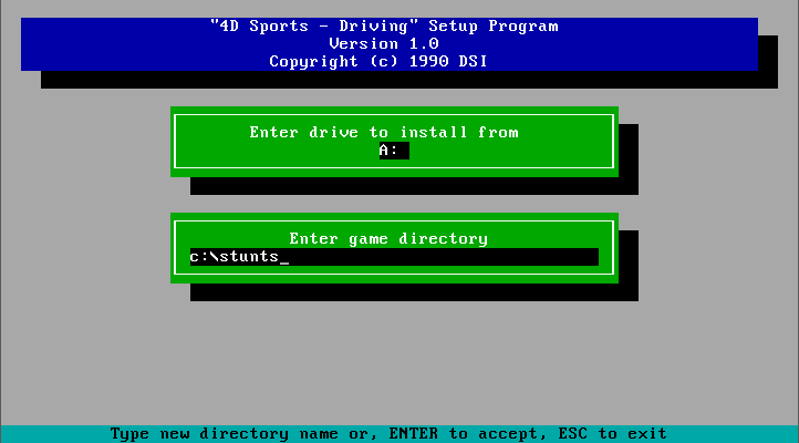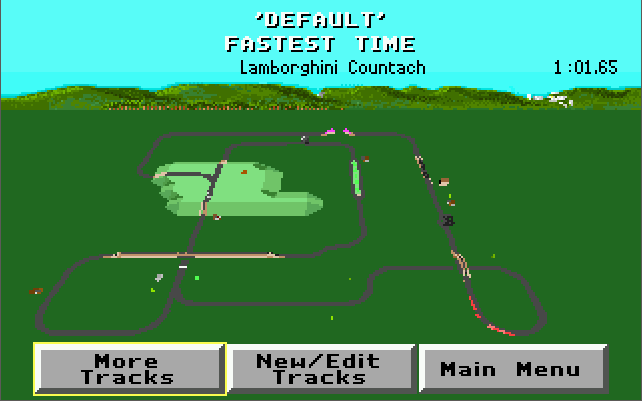 "4D Sports - Driving is best played in MCGA mode, which provides 256 colours (though it doesn't use a full colour palette, it's still slightly better than EGA). Sound Blaster audio is the best option for music and sound effects, and the game will run at a decent frame rate if you have a 386DX-16 or faster. Having a mouse driver loaded will make menu navigation easier in the replay mode and track editor. While racing, the keys work just fine, but I find a decent-quality arcade analogue joystick with a short stick is best. Switch off the music using CTRL-M if it gets annoying."