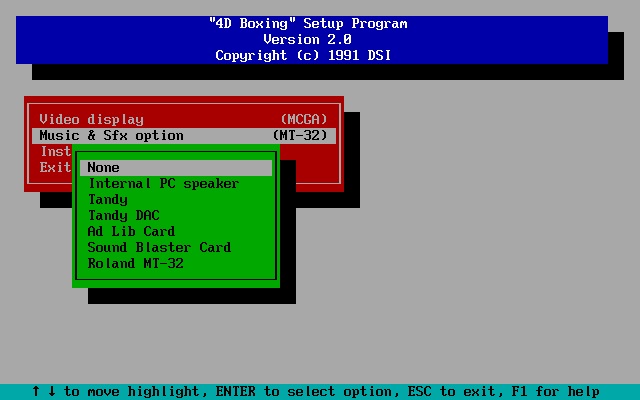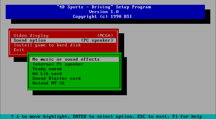 There are numerous sound options including Ad Lib, Tandy/PCjr, Sound Blaster and Roland MT-32. The graphics options are also impressive, ranging from Hercules, CGA, Tandy, EGA and MCGA. 4D Sports Driving will run on an XT (8088 or 8086) but is best-performing on at least a 386DX-25. Several performance-related tweaks can be made under 'Options->Graphic Detail' if you find your PC is struggling to give you a decent frame rate.