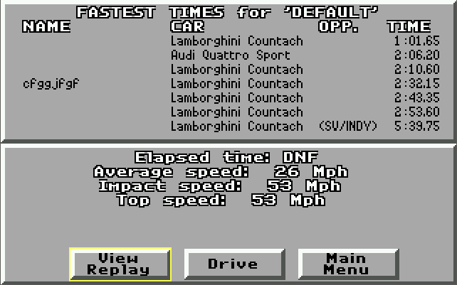 | Default Track | 1:56:55 | Lamborghini Countach. Took the right turn at the fork - this is much faster but you do have to navigate the corkscrew. Burnie Rubber did it in 2:14.95 in the Acura NSX. My average speed was 85 mph, top speed 132 mph, and I did 4 jumps. The best time I got taking the left fork was 2:31.4 (also in the Countach). |