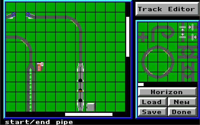 The tracks included in the game are aligned to your competitors, since each competitor has strengths and weaknesses and it's worthwhile you reading up on them when choosing who to race against. The track editor is very easy to use - a 30 x 30 grid provides the game world into which you can select and drop objects with the mouse such as pieces of road, dirt or ice, corkscrews, bridges (spans), divided highways, chicanes, and various scenery objects like buildings and trees.
