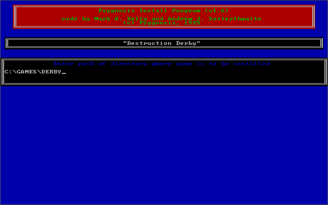 Destruction Derby has a good save game feature. Between races in the you can save your Championship progress by hitting the Save button and choose from one of the 8 available 'slots'. You will be prompted to enter a name for the save game - you must go down to the OK button and hit enter to save it.