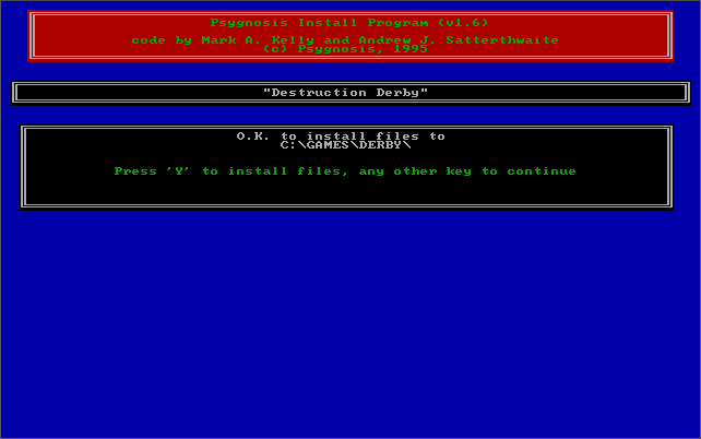 Destruction Derby must be installed to your hard disk (see How to Setup), but also requires the game's CD-ROM to be present when playing the game (it plays its music audio files off the CD). If you fail to insert the game CD into the drive you will receive this error: