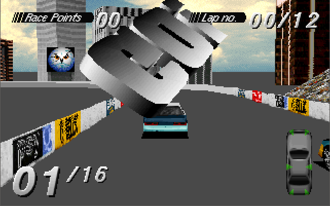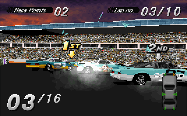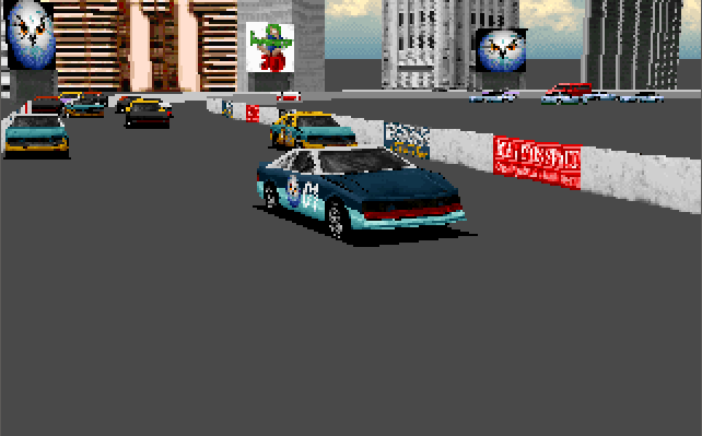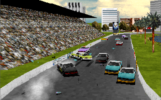 The 3D models of the cars are nicely detailed, as is all the surrounding scenery. The standard game runs in a resolution of 320 x 200, though a special version was bundled with the Diamond Stealth 3D 2000 graphics card in April 1996 and ran with hardware acceleration, an upscaled resolution of 512 x 384 and with more object texturing. This version will also probably work with other S3 ViRGE-based graphics cards. At 320 x 200, it does appear very blocky by today's standards but in 1994 it was perfectly normal. If there's one complaint I have, it's that when cars are damaged you get a splintering effect during the crash but any parts that should fall off don't. Perhaps I'm being too picky but it would have been nice to have bits of the cars remain on the ground and act as further obstructions.