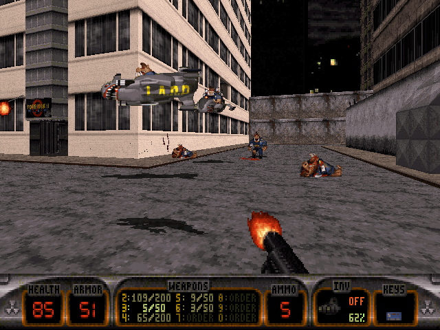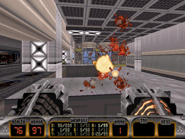 Duke Nukem 3D is a well-known first-person shooter that arrived very late in the DOS era of gaming, 1996. It started life as a shareware game, with just the first episode released, but 5 months later the remaining two episodes had been completed, so anyone who registered their game got the full release which included copies of Duke Nukem 1 and 2 as well. The Atomic Edition arrived at the end of 1996 which featured a new fourth episode. In the subsequent years, several official or approved add-on expansion packs were released, including Duke it Out in D.C. (1997), Duke Caribbean: Life's a Beach (1998), and Nuclear Winter (1998).