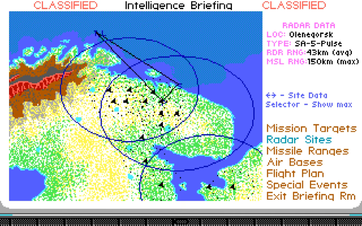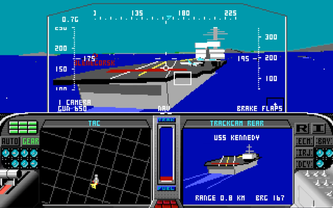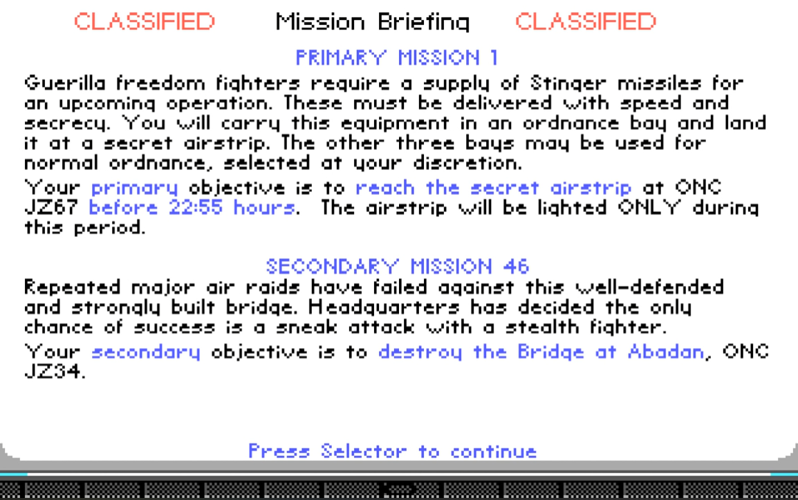 | 435.04 | 16th May 1989 | Final release. Comes with AdLib support. Fixes: autopilot problem associated with wide-angle views now corrected, lockups on certain clones [particularly Lazers] fixed, pilot promotion sequence has been corrected and now agrees with the manual, mobile SAMs are now treated as SAMs (as documented) and not as bunkers, the divide overflow problem on certain clones/joystick cards has been fixed, and the Carlsbad bridge under the mountain has been fixed. |