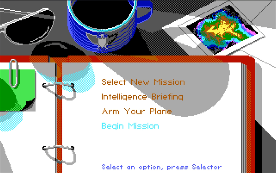The game gives you the option to play any mission in a 'practice mode' if you want to just get used to the aircraft before committing your rookie pilot to the potential of making a mistake and tarnishing their blank record. In these missions enemy missiles and guns will do no harm to you, and you will bounce off the ground if you fly too low. You will of course not be scored on the outcome of these practice missions, but it's a great way to get started in your understanding of how it flies and what controls do what. The mission selection, briefing and aircraft loading screens are nice and clean with simple controls for selection. Just Up and Down arrow keys and enter to select, or use the joystick.