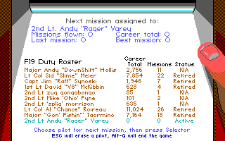 When your mission is complete, you are given a score based on the successful primary and secondary targets, the amount of damage you took, and whether you succeeded in landing safely or had to bail out. Each tertiary target you come across and destroy also gives you more points, and all these points are multiplied depending on the level of difficulty you chose before taking the mission. At times you will be awarded a combat decoration for your efforts, and will also periodically be promoted from your starting rank of 2nd Lieutenant up through the seven ranks to Brigadier General. Your progress is saved automatically, and if you want to have several pilots on the go at the same time, the Pilot Roster has plenty of "slots" you can use. If you are killed in action, your pilot is of course no longer selectable to fly, so a new one must be created.
