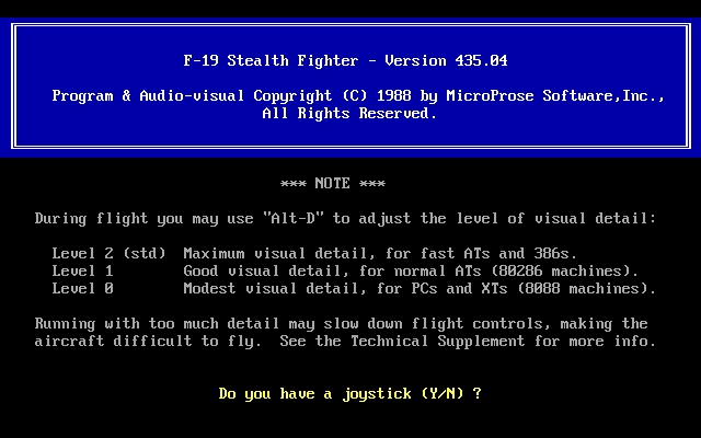 The game does not come with a setup program. Instead, simply running the F19.COM file to start the game automatically takes you through some setup options each time. Note that you cannot select an audio option manually this way - if you wish to change to a different audio choice, run F19.COM with command-line arguments (see further down).