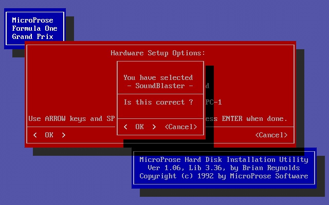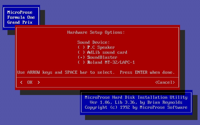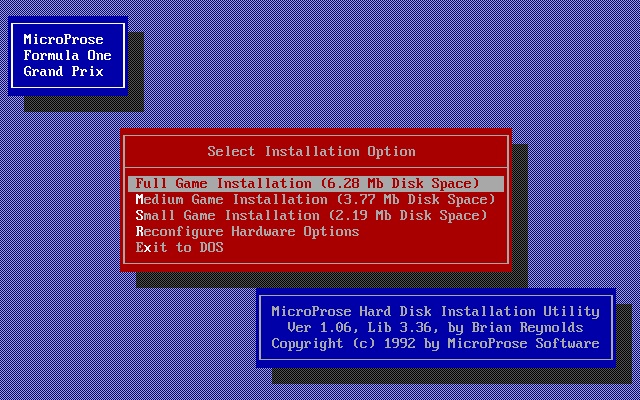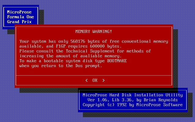 F1GP requires 600,000 bytes (586 KB) of free conventional memory to run. If you struggle to free up sufficient space after installing the game, go to the game's directory and run BOOTMAKE to create a bootable floppy disk.