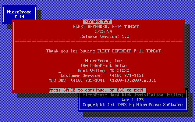 | 1.2 | 6 May 1994 | (Note: There was no v1.1). v1.2 introduced many fixes over the initial 1.0 release. Heading drift fixed, Enemy chutes fall slower, Other planes now leave the carrier at same speed the player plane does, Padlock jitters are gone, Afterburners on other planes will be on during proper conditions, Disabling training mode in Oceana no longer crashes your plane when you take off from carrier, Planes will not circle the first waypoint at the start of a mission unless told to, E key will work only if training mode is on or Easy Mode landing is on, Your wingman's lights will turn off when he is attacking, You will no longer padlock dead missiles, Button 4 (or 'K' key) will now break lock (previously this was the 'L' key), You can no longer raise your gear on the carrier deck, Gun difficulty has been increased on Authentic weapon setting, No crash log messages after you eject, Planes will take off when they should (no more meeting the 2nd half of a strike group leaving as you return), Helicopters will land on the carrier, Higher level enemies will use Allied strategies in knife fight, and stick around much longer, All wingmen in group will match leader's skill instead of being average, AIs can fire Phoenix missiles at same range we can, Explosions will take place on top of land, Carrier guns will not fire in "Opposites" training mission, Stategic Strike in Fighting Withdrawl has been fixed (what you were escorting didn't match what the mission was looking for. The other strategic strike missions are correct), The Rush Hour missions in El Dorado Canyon have been tweaked, Removed "bing-bongs" from buttons, Sped up debriefing; holding mouse on button now cycles the list, Fixed RIO/pilot wing reversals on edit pilot box, Medal of Honor will now appear in medals box, Adlib Gold digital wrapper sounds fixed, Added six missing planes to enemies list in scramble screen, Fly over option on missions ending in death has been removed from top two difficulty levels, Not enough memory error reporting more robust, Pilot rank properly updated in HOF, RIO rank now is the same as pilot rank everywhere, Mach indicator on the HSD has been fixed, Turning radar off will now break lock (closure and range data will not be displayed on the HUD), Fixed slight deviation problem with ball, Data Link ranges have been expanded, Addition of COCKPIT.GIF which labels the pilot's cockpit (to view use any GIF File viewer), F14 JUKEBOX has been added (to listen to FLEET DEFENDER's music goto the \MPS\F14 Directory and type "F14JUKE"). |