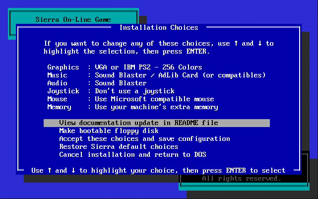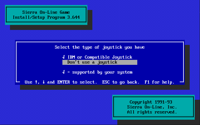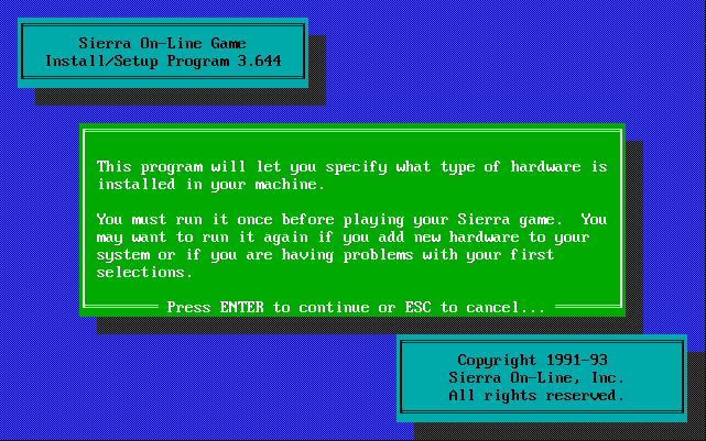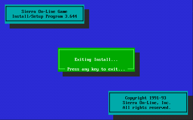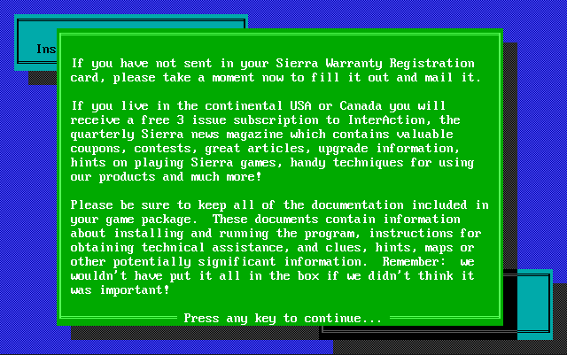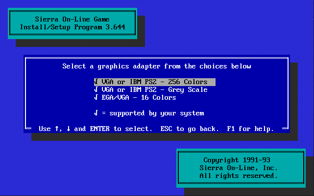 If installing in Windows (DOS is recommended by Sierra!), the game will not run properly if your video is set to a 24-bit colour depth (64,000 colours) or True Color mode (1.6M colours). Use a 256-colour mode.