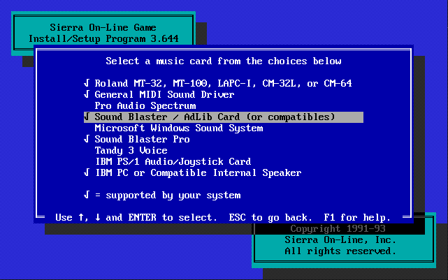 | System Requirements | Intel 80286 16 MHz (386-20 recommended), DOS 5.0 or later, 640KB RAM (2MB for CD-ROM version) Graphics support for EGA, VGA, and MCGA. Audio support for PC Speaker, PS/1 Audio card, Thunderboard, Tandy/PCjr, MSS, Disney Sound Source, Pro Audio Spectrum or PAS16, Ad Lib, Sound Blaster/Pro, Sound Blaster 16, Roland MT-32 and General MIDI. Keyboard and Mouse supported (and recommended). |