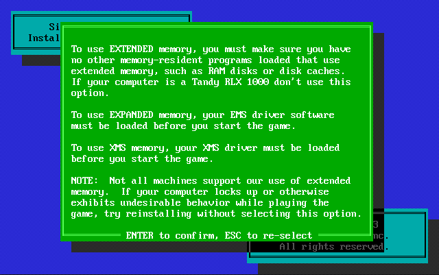 The game requires a minimum of 570 KB of free conventional memory if you are using the PC speaker for audio. For non-DAC sound cards, you need 572.3 KB, and for any sound cards that play digitized sound you need 575.2 KB free. For the Pro Audio Spectrum cards, you need 581 KB of free memory.