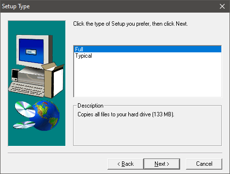 As you can see, a 'Full' installation will take up 133 MB, copying all required game files to the hard disk. The 'Typical' option will use up just 59 MB, leaving the track files and full motion videos on the CD-ROM.