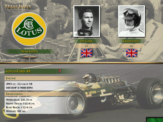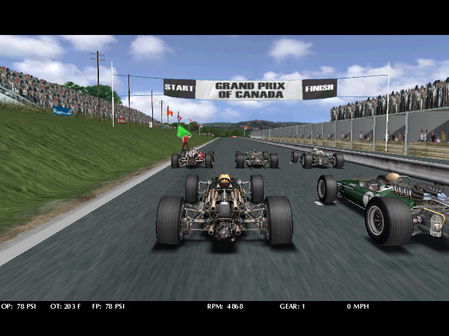 GPL was endorsed by the FIA so all the teams, drivers, and cars are accurately reproduced from the 1967 Automobile World Championship (as it was called back then), including all eleven of the circuits that made up the racing season: Kyalami, Mexico, Monaco, Monza, Mosport, Nürburgring Nordschleife, Rouen, Silverstone, Spa, Watkins Glen and Zandvoort.