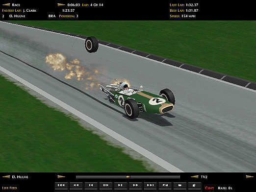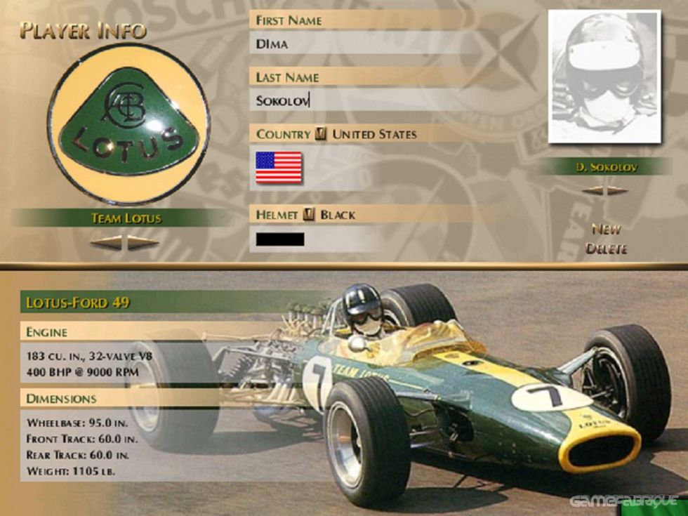 You can take part in single races including practice and qualifying sessions, or enter the complete 1967 World Championship race season. It is recommended you start with the "Novice Trainer" mode with the Damage level set to "None". There are a few driving aids that can be enabled as you learn to handle the game, including automatic gear shifting, braking help and throttle help.