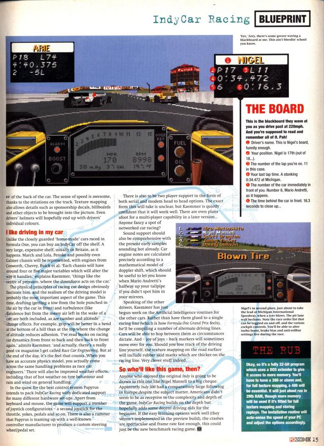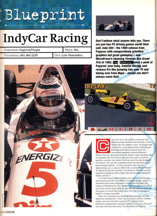 Hot on the heels of Geoff Crammond's excellent Formula One Grand Prix, Papyrus Design got to work on its second racing title, IndyCar Racing, after its foray into the genre 2 years earlier with Indianapolis 500: The Simulation.