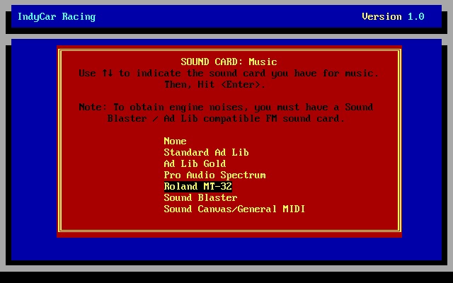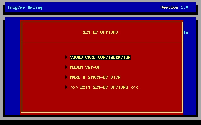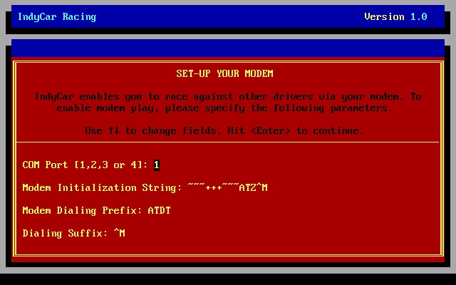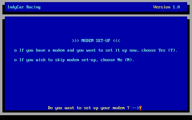 IndyCar Racing allows two racers to compete against one another via the Two Player Race menu. They must be connected over a null-modem cable or between two modems running at 9600 baud.