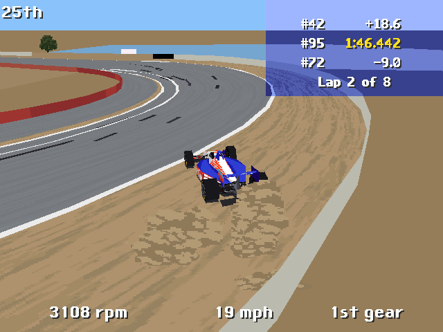 IndyCar Racing expanded on the original in every way - more tracks and better graphics and sound, but keeping what made its predecessor great - variable levels of difficulty/complexity. Papyrus also made sure they got a full set of licences for the game, so not only do you race real IndyCar drivers in real teams, but also the advertising billboards are exact placements that exist on the actual circuit (when, they were in the 1993 IndyCar season). There are just one or two drivers missing such as Nigel Mansell, and Al Unser Jr. Oh, and the Indianapolis Speedway didn't make it into the initial release.