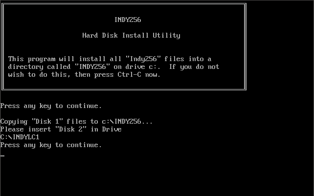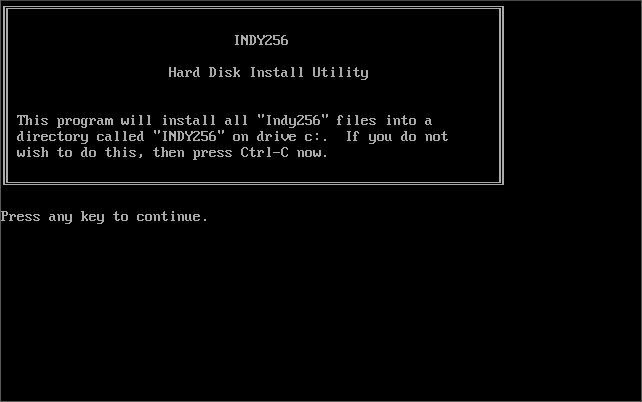 Both INDY3 and INDY256 have optional command-line arguments you can use to force the control method and audio setup. INDY256 can display the list of valid arguments by running INDY256 /?. INDY3 does not have this, but the arguments still work the same as those listed here, plus has the option of different graphics modes: