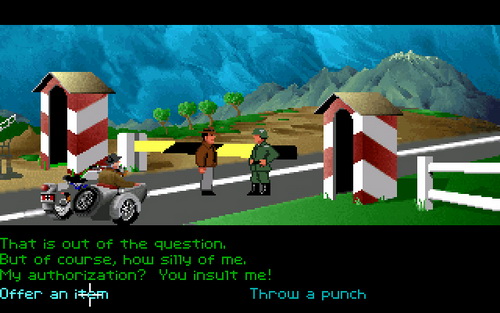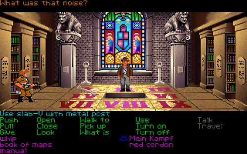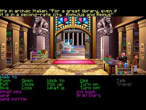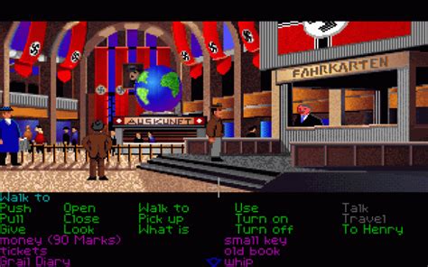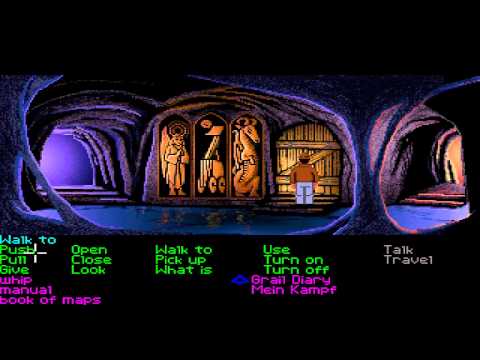 The year is 1938, and Indy is joined by his father to prevent Hitler from capturing the Holy Grail. If you're used to Lucasfilm Games and LucasArts graphic adventures, you'll be at home with this one. At the bottom of the screen are common verbs you can use to interact with the scene above. You can open and close things, talk to people, use objects you pick up on other objects or the environment, and give items to others. You are able to use the Holy Grail Diary as you progress through the story to help give you clues as to what to do.