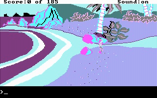 My version of this game has AGI interpreter version 2.917 (the most up-to-date interpreter released for this game), and by default it runs in EGA graphics mode. Running with the -c option worked well. -h wasn't tested as it requires a TTL (digital signal) monitor. -v I hoped would work but displayed corrupted EGA graphics.