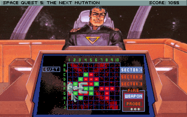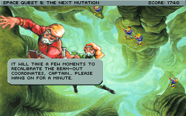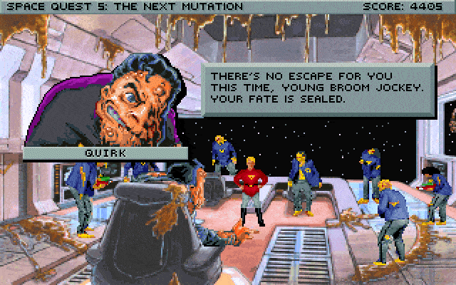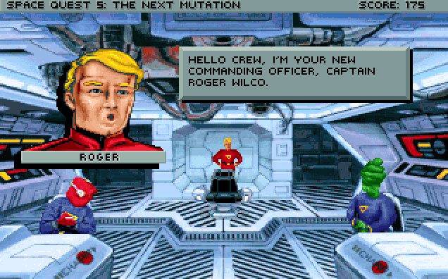 Space Quest V: The Next Mutation picks up where Space Quest IV left off: After jumping back and forward through time, Roger Wilco returns to StarCon Space Academy where he cheats on the aptitude test and becomes captain of his own vessel, a beaten-up garbage scow, which is fitting given his janitorial roots.