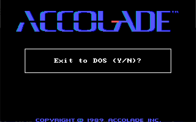 Press Ctrl-X and when prompted "Exit to DOS (Y/N)?", press "Y" to exit to DOS. Alternatively, keep pressing ESC to return to the Accolade opening animation, then hit ESC once more followed by "Y"