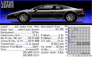 Also released alongside the game's launch was the first car expansion disk: Test Drive II: The Supercars. This added five news cars, many of which were present in the original Test Drive game: the RUF Twin Turbo, Lotus Turbo Esprit, Lamborghini Countach, Ferrari Testarossa, and the Chevrolet Corvette ZR1. Some of these you will no doubt recognize as being standard cars in the original Test Drive game. With these you could either drive one of these yourself, have your computer rival drive it, or both drive in the same make/model: