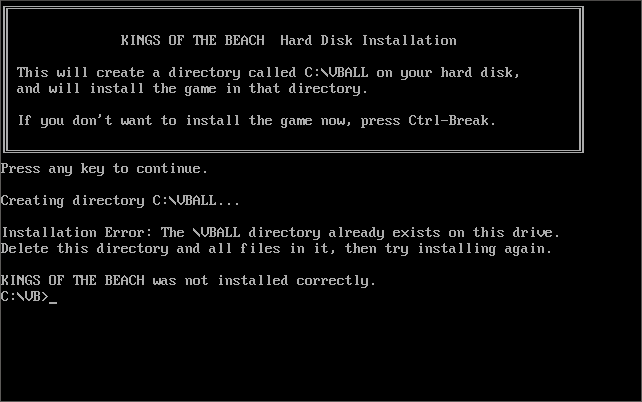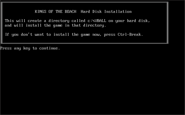 To install Kings of the Beach to your hard disk, insert GAME DISK 1 and run the INSTALL.BAT file with a single argument that denotes the hard disk drive letter to install to, e.g.