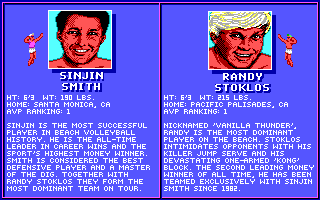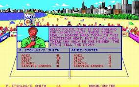 As you progress through the tournament with your escort, Spike, the skilled computer players become tougher to beat. The wind direction affects your serve, of which you can choose from three different types, though returning the ball over the net appears to put it randomly - you have no control over where to aim your return.