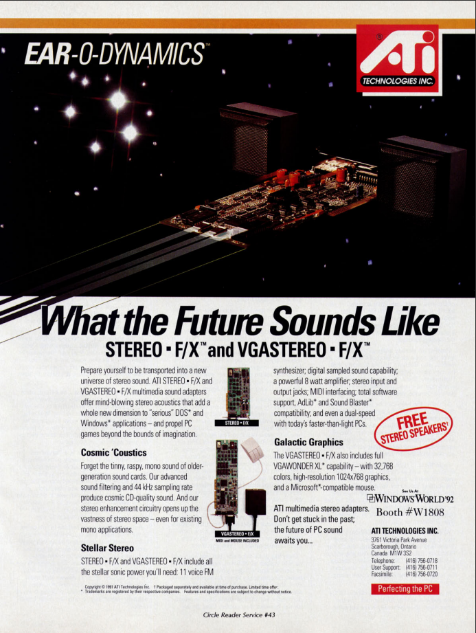 Launched in 1992, The VGA Stereo F/X combined a VGA Wonder XL with a Sound Blaster 1.5 onto a single 16-bit ISA card. The Stereo F/X was a cut-down card that omitted the video circuitry.