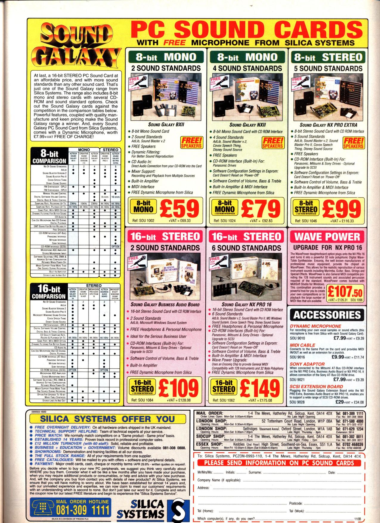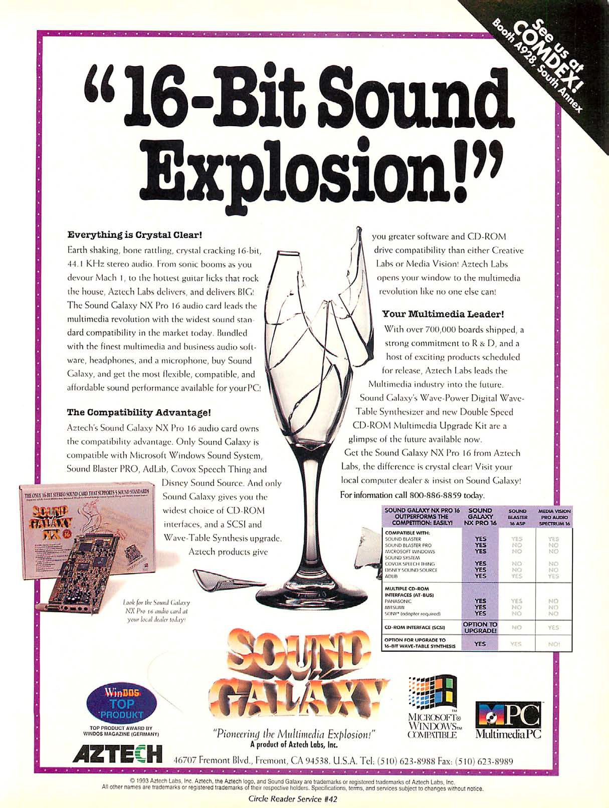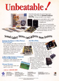 "The most striking thing about the Sound Galaxy NX is that its manufacturer, Aztech Systems, claims that it emulates just about every other popular low-cost card on the market. The systems it mimics are Ad Lib, Sound Blaster, Covox Speech Thing, and Disney Sound Source. That's an impressive line-up as far as the dedicated games player is concerned because it amounts to this particular card being supported by just about every PC game released in the last couple of years. Performance wise, this board produced good, clear sounds in all of its modes, although I did occasionally notice some interference, especially at high volumes."     PC Review, November 1992