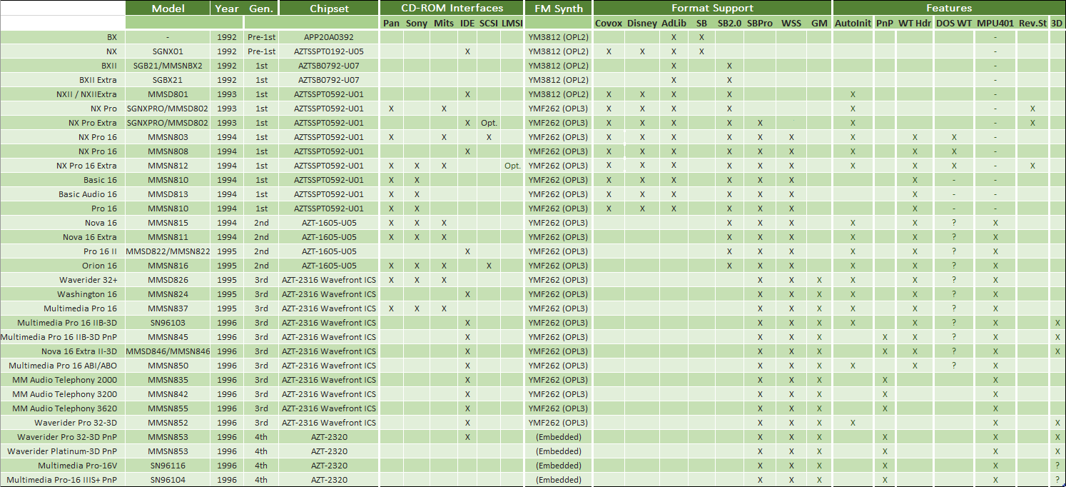 A summary of all the Aztech sound cards for DOS. Click for a larger version