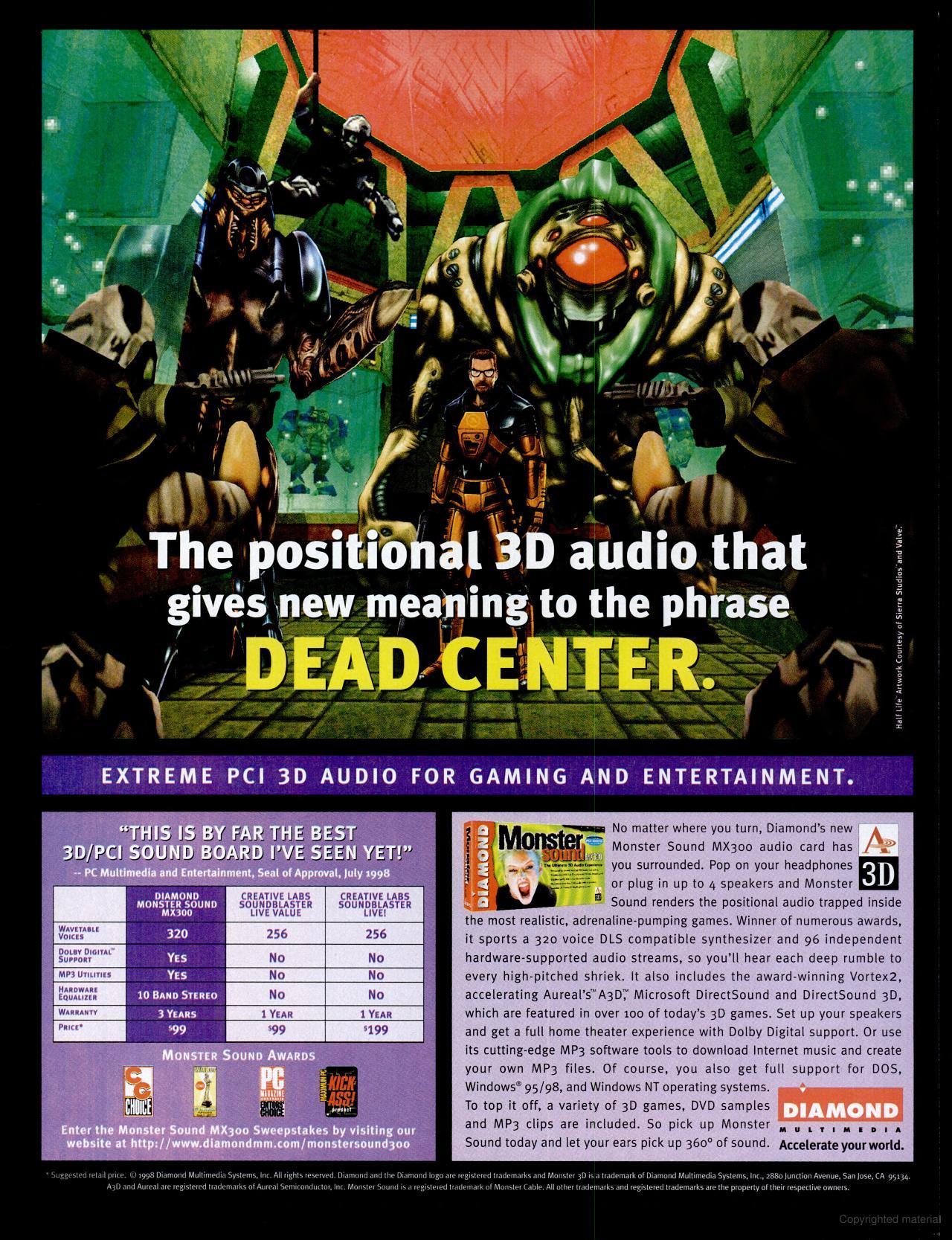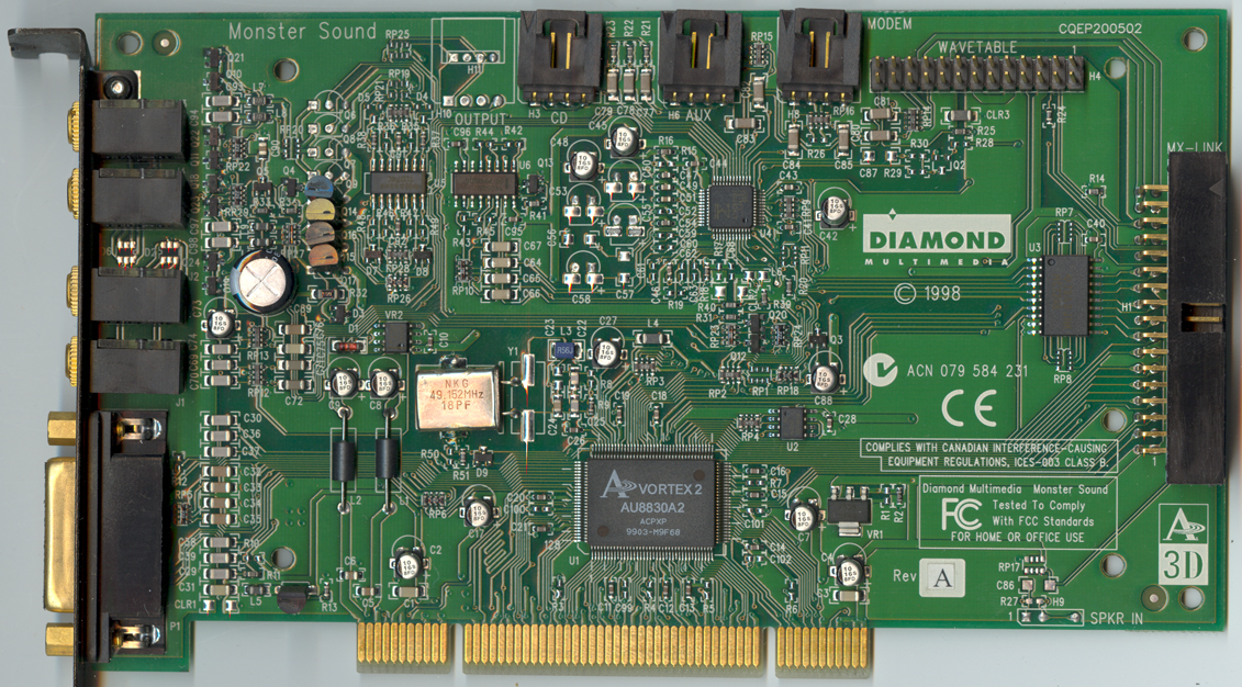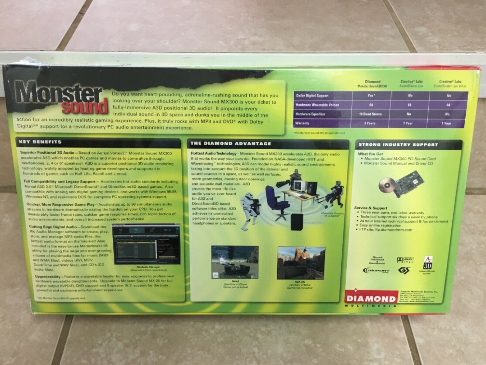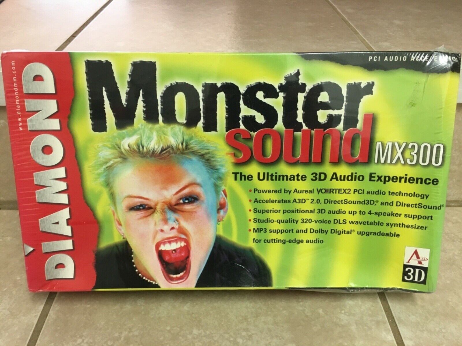 The Monster Sound MX300 was released in 1998. It used the Aureal Vortex 2 chip with its A3D 2.0 technology to produce some of the very best 3D positional audio capability available. It also had an embedded DLS wavetable synthesizer with 320 voices.