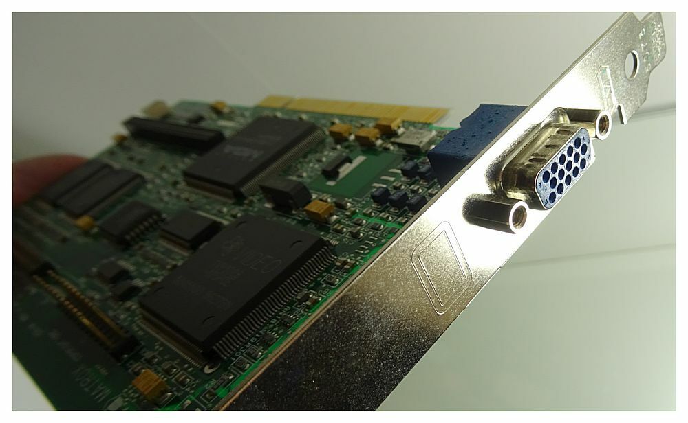 The retail 4 MB Millennium with its main chip running at 60 MHz, the 220 MHz RAMDAC and the Media XL port. Shame about the slower 60ns memory though.