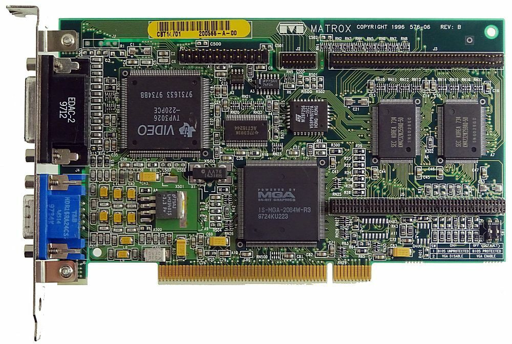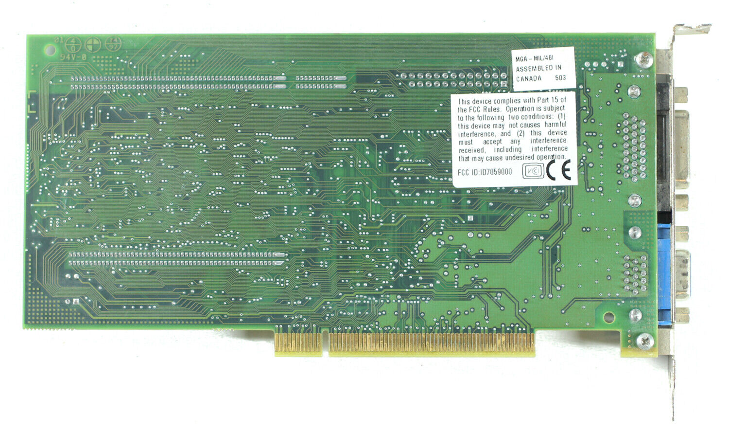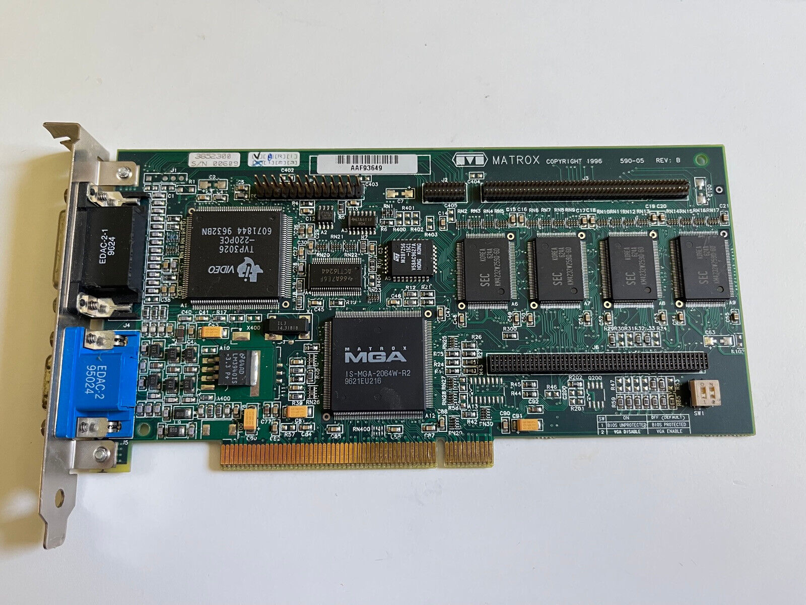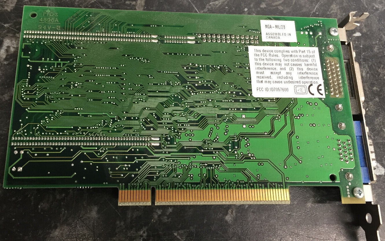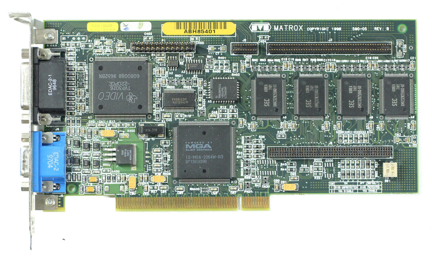 The MGA Millennium went through a number of different revisions from 1995 to 1997. Given the many varieties of Matrox cards used the Millennium moniker, it can be a little bit confusing. All MGA Millennium cards had chipsets and model numbers with "MGA-MIL/" or "2064" on them. If you see a card with other codes, these are other Matrox models (1064=Mystique, 1164=Mystique 220, MIL2/ or 2164=Millennium II, etc). Likewise, anything with a G-code like G+, G2+, G200, etc, are also different [and later] models. Millennium IIs are easy to spot in pictures as they have thicker memory expansion sockets.