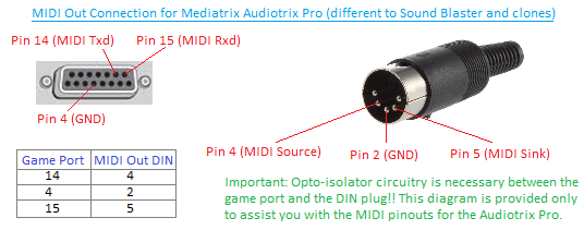 IMPORTANT: This card's MIDI/game port is wired differently to most Sound Blaster-compatible MIDI/game port cables. It is believed that the cable that was provided with the Audiotrix Pro had three tails - MIDI IN, OUT and THRU. Check this diagram for details of what pins provide the MIDI in/out signals for the MediaTriX cards. *For reference, Sound Blaster cards use pin 1 for TxD, pin 12 for Rxd and pin 4 for GND.