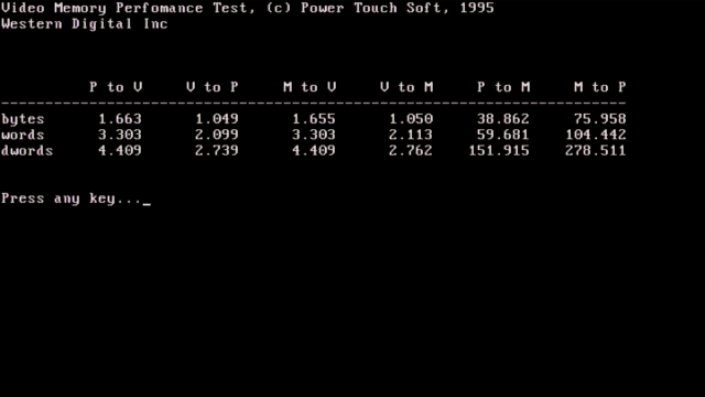 The WD90C24 features hardware Windows 2D acceleration with BitBlt and line draw functions, and a programmable 64x64 cursor. WD90C24 has a 16- or 32-bit memory interface from 256 KB up to 1 MB (70, 80 or 100ns), and supports up to 65,536 colours (HiColor) at 640x480. The maximum resolution is 1024x768 in 256 colours noninterlaced at 60 Hz, or 1024x768x16 interlaced at 43 Hz.